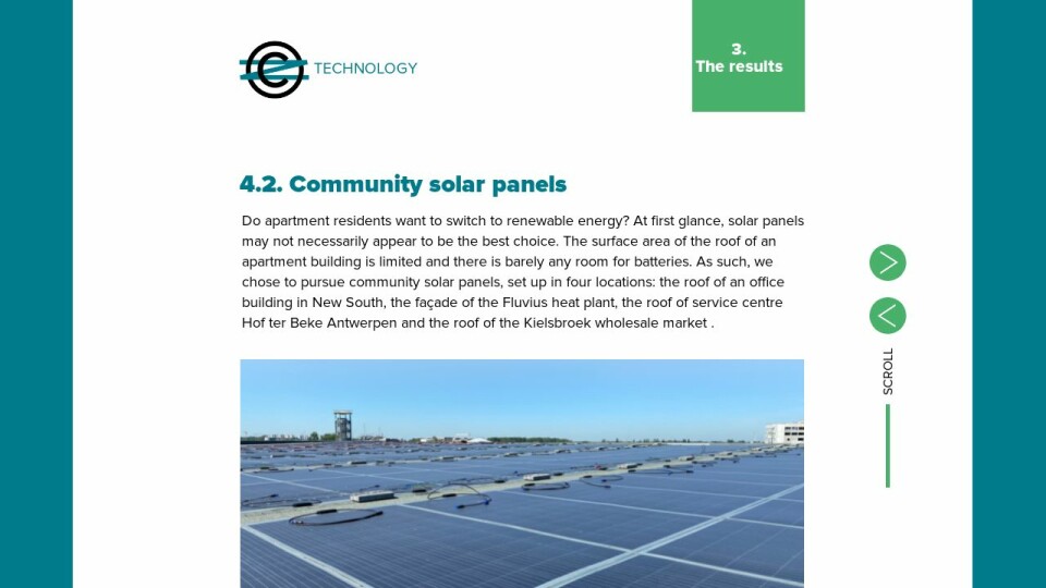 Do apartment residents want to switch to renewable energy? At first glance, solar panels may not necessarily appear to be the best choice. The surface area of the roof of an apartment building is limited and there is barely any room for batteries. As such, we chose to pursue community solar panels, set up in four locations: the roof of an office building in New South, the façade of the Fluvius heat plant, the roof of service centre Hof ter Beke Antwerpen and the roof of the Kielsbroek wholesale market .