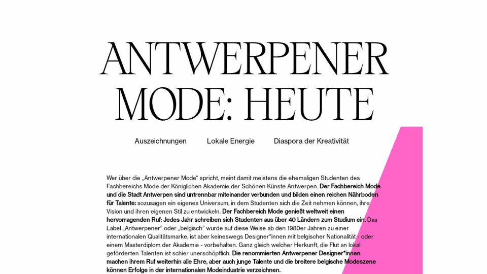 Wer über die „Antwerpener Mode“ spricht, meint damit meistens die ehemaligen Studenten des Fachbereichs Mode der Königlichen Akademie der Schönen Künste Antwerpen. Der Fachbereich Mode und die Stadt Antwerpen sind untrennbar miteinander verbunden und bilden einen reichen Nährboden für Talente: sozusagen ein eigenes Universum, in dem Studenten sich die Zeit nehmen können, ihre Vision und ihren eigenen Stil zu entwickeln. Der Fachbereich Mode genießt weltweit einen hervorragenden Ruf: Jedes Jahr schreiben sich Studenten aus über 40 Ländern zum Studium ein. Das Label „Antwerpener” oder „belgisch” wurde auf diese Weise ab den 1980er Jahren zu einer internationalen Qualitätsmarke, ist aber keineswegs Designer*innen mit belgischer Nationalität - oder einem Masterdiplom der Akademie - vorbehalten. Ganz gleich welcher Herkunft, die Flut an lokal geförderten Talenten ist schier unerschöpflich. Die renommierten Antwerpener Designer*innen machen ihrem Ruf weiterhin alle Ehre, aber auch junge Talente und die breitere belgische Modeszene können Erfolge in der internationalen Modeindustrie verzeichnen.