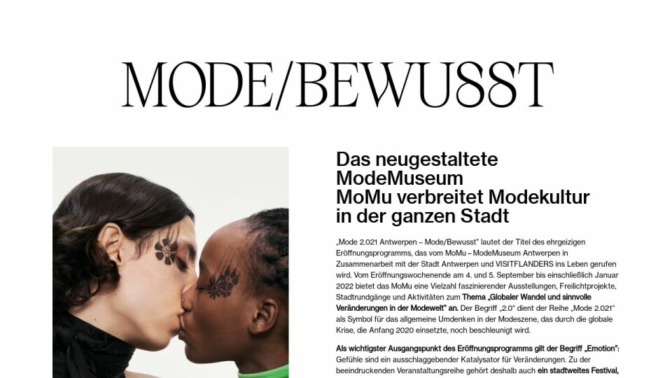 „Mode 2.021 Antwerpen – Mode/Bewusst” lautet der Titel des ehrgeizigen Eröffnungsprogramms, das vom MoMu – ModeMuseum Antwerpen in Zusammenarbeit mit der Stadt Antwerpen und VISITFLANDERS ins Leben gerufen wird. Vom Eröffnungswochenende am 4. und 5. September bis einschließlich Januar 2022 bietet das MoMu eine Vielzahl faszinierender Ausstellungen, Freilichtprojekte, Stadtrundgänge und Aktivitäten zum Thema „Globaler Wandel und sinnvolle Veränderungen in der Modewelt” an. Der Begriff „2.0“ dient der Reihe „Mode 2.021“ als Symbol für das allgemeine Umdenken in der Modeszene, das durch die globale Krise, die Anfang 2020 einsetzte, noch beschleunigt wird.