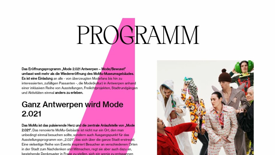 Das Eröffnungsprogramm „Mode 2.021 Antwerpen – Mode/Bewusst” umfasst weit mehr als die Wiedereröffnung des MoMu-Museumsgebäudes. Es ist eine Einladung an alle - von überzeugten Modefans bis hin zu interessierten, zufälligen Passanten -, die Mode(kultur) in Antwerpen anhand einer inklusiven Reihe von Ausstellungen, Freilichtprojekten, Stadtrundgängen und Aktivitäten einmal anders zu erleben.