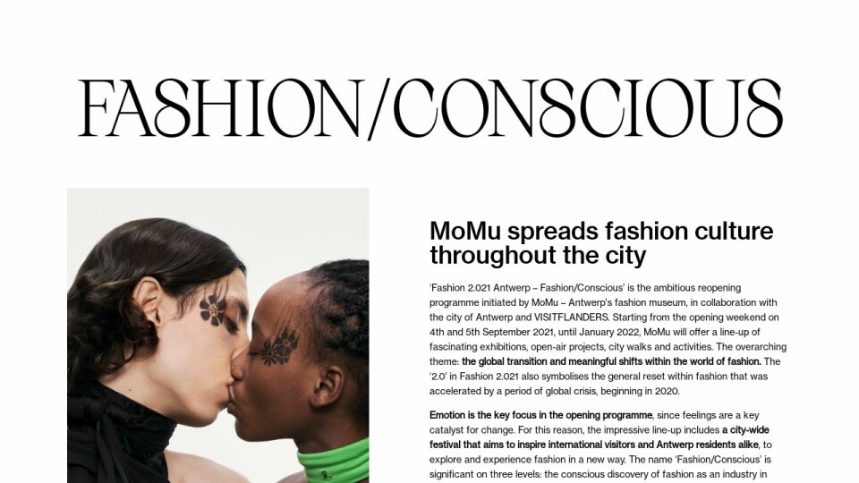 ‘Fashion 2.021 Antwerp – Fashion/Conscious’ is the ambitious reopening programme initiated by MoMu – Antwerp's fashion museum, in collaboration with the city of Antwerp and VISITFLANDERS. Starting from the opening weekend on 4th and 5th September 2021, until January 2022, MoMu will offer a line-up of fascinating exhibitions, open-air projects, city walks and activities. The overarching theme: the global transition and meaningful shifts within the world of fashion. The ‘2.0’ in Fashion 2.021 also symbolises the general reset within fashion that was accelerated by a period of global crisis, beginning in 2020.