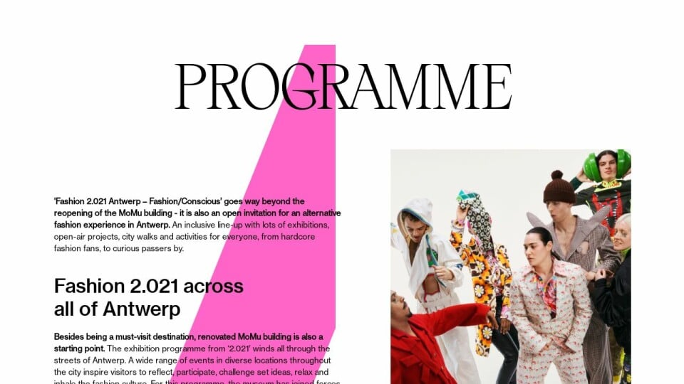 'Fashion 2.021 Antwerp – Fashion/Conscious’ goes way beyond the reopening of the MoMu building - it is also an open invitation for an alternative fashion experience in Antwerp. An inclusive line-up with lots of exhibitions, open-air projects, city walks and activities for everyone, from hardcore fashion fans, to curious passers by.