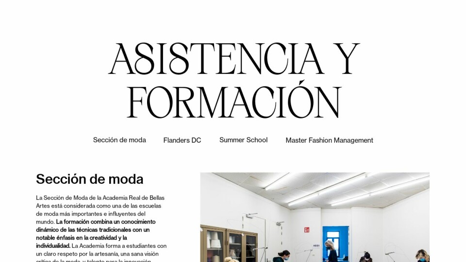 La Sección de Moda de la Academia Real de Bellas Artes está considerada como una de las escuelas de moda más importantes e influyentes del mundo. La formación combina un conocimiento dinámico de las técnicas tradicionales con un notable énfasis en la creatividad y la individualidad. La Academia forma a estudiantes con un claro respeto por la artesanía, una sana visión crítica de la moda, y talento para la innovación.