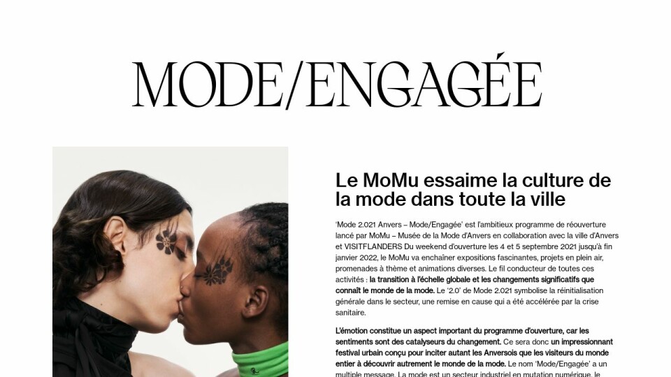 L’émotion constitue un aspect important du programme d’ouverture, car les sentiments sont des catalyseurs du changement. Ce sera donc un impressionnant festival urbain conçu pour inciter autant les Anversois que les visiteurs du monde entier à découvrir autrement le monde de la mode. Le nom ‘Mode/Engagée’ a un multiple message. La mode est un secteur industriel en mutation numérique, le styliste a un rôle prépondérant à jouer et le consommateur est de plus en plus sensible aux enjeux écologiques. ‘Mode/Engagée’ souligne également que notre style vestimentaire répond à des choix conscients. L’appellation rappelle enfin la position internationale de la cité scaldienne dans l’évolution de la mode, une ville qui attire tout autant les acteurs du secteur du monde entier que ceux qui remettent son mode de fonctionnement en question.