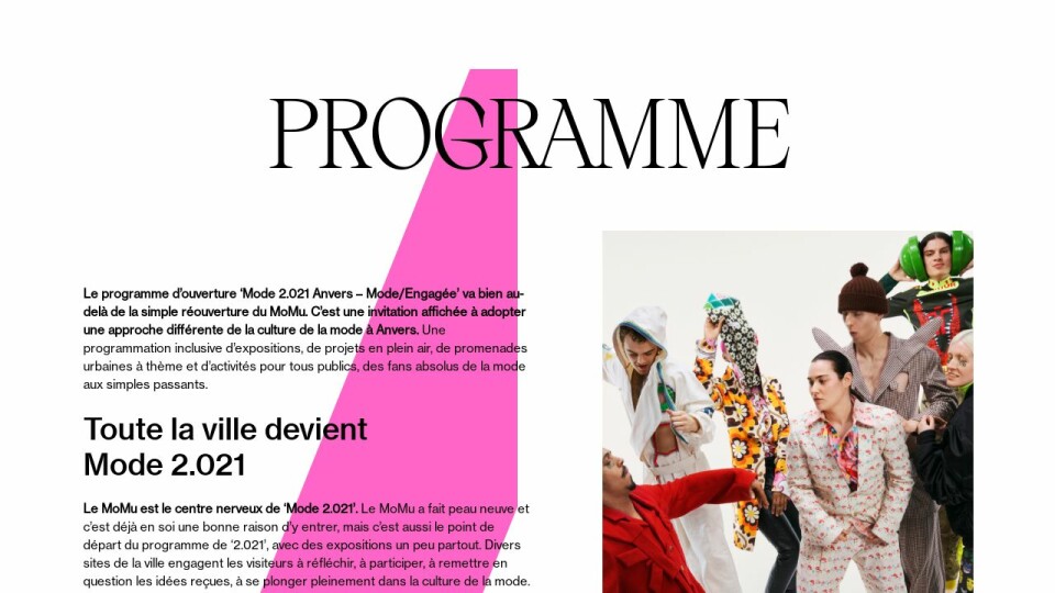 Le programme d’ouverture ‘Mode 2.021 Anvers – Mode/Engagée’ va bien au-delà de la simple réouverture du MoMu. C’est une invitation affichée à adopter une approche différente de la culture de la mode à Anvers. Une programmation inclusive d’expositions, de projets en plein air, de promenades urbaines à thème et d’activités pour tous publics, des fans absolus de la mode aux simples passants.