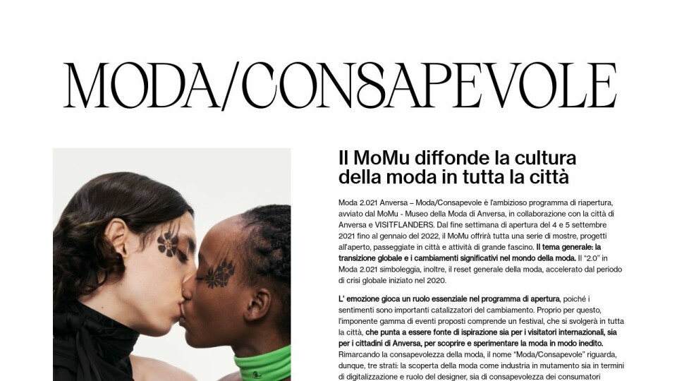 Moda 2.021 Anversa – Moda/Consapevole è l’ambizioso programma di riapertura, avviato dal MoMu - Museo della Moda di Anversa, in collaborazione con la città di Anversa e VISITFLANDERS. Dal fine settimana di apertura del 4 e 5 settembre 2021 fino al gennaio del 2022, il MoMu offrirà tutta una serie di mostre, progetti all'aperto, passeggiate in città e attività di grande fascino. Il tema generale: la transizione globale e i cambiamenti significativi nel mondo della moda. Il “2.0” in Moda 2.021 simboleggia, inoltre, il reset generale della moda, accelerato dal periodo di crisi globale iniziato nel 2020.
