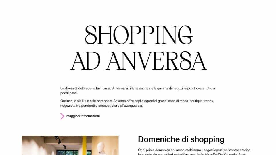 Ogni prima domenica del mese molti sono i negozi aperti nel centro storico. In queste vie e quartieri potrai fare acquisti a bizzeffe: De Keyserlei, Meir, Diamantwijk, Wilde Zee, Modebuurt, Hoogstraat, Kloosterstraat, Steenhouwersvest, Kammenstraat, Groenplaats e Het Zuid. Gli orari di apertura possono essere diversi da quelli dei giorni infrasettimanali. Di domenica, la maggior parte dei negozi è aperta solo di pomeriggio.