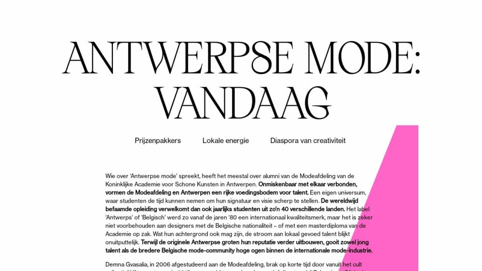 Wie over ‘Antwerpse mode’ spreekt, heeft het meestal over alumni van de Modeafdeling van de Koninklijke Academie voor Schone Kunsten in Antwerpen. Onmiskenbaar met elkaar verbonden, vormen de Modeafdeling en Antwerpen een rijke voedingsbodem voor talent. Een eigen universum, waar studenten de tijd kunnen nemen om hun signatuur en visie scherp te stellen. De wereldwijd befaamde opleiding verwelkomt dan ook jaarlijks studenten uit zo’n 40 verschillende landen. Het label ‘Antwerps’ of ‘Belgisch’ werd zo vanaf de jaren ‘80 een internationaal kwaliteitsmerk, maar het is zeker niet voorbehouden aan designers met de Belgische nationaliteit – of met een masterdiploma van de Academie op zak. Wat hun achtergrond ook mag zijn, de stroom aan lokaal gevoed talent blijkt onuitputtelijk. Terwijl de originele Antwerpse groten hun reputatie verder uitbouwen, gooit zowel jong talent als de bredere Belgische mode-community hoge ogen binnen de internationale mode-industrie.