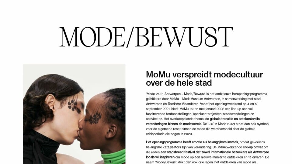 ‘Mode 2.021 Antwerpen – Mode/Bewust’ is het ambitieuze heropeningsprogramma geïnitieerd door MoMu – ModeMuseum Antwerpen, in samenwerking met stad Antwerpen en Toerisme Vlaanderen. Vanaf het openingsweekend op 4 en 5 september 2021, biedt MoMu tot en met januari 2022 een line-up aan vol fascinerende tentoonstellingen, openluchtprojecten, stadswandelingen en activiteiten. Het overkoepelende thema: de globale transitie en betekenisvolle veranderingen binnen de modewereld. De ‘2.0’ in Mode 2.021 staat dan ook symbool voor de algemene reset binnen de mode die werd versneld door de globale crisisperiode die begon in 2020.