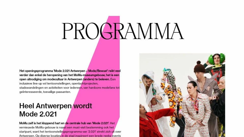Het openingsprogramma ‘Mode 2.021 Antwerpen – Mode/Bewust’ reikt veel verder dan enkel de heropening van het MoMu-museumgebouw, het is een open uitnodiging om modecultuur in Antwerpen (anders) te beleven. Een inclusieve line-up vol tentoonstellingen, openluchtprojecten, stadswandelingen en activiteiten voor iedereen, van hardcore modefans tot geïnteresseerde, toevallige passanten.