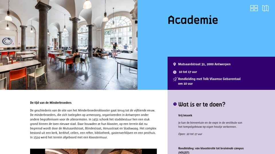 Docenten en studenten van de Universiteit Antwerpen en de Koninklijke Academie Antwerpen staan je te woord en nemen je mee voor een exclusieve rondleiding op de site langs plaatsen waar je nooit eerder kwam. Je start aan de Bourlapoort (Mutsaardstraat 31) en eindigt op de Stadswaag.