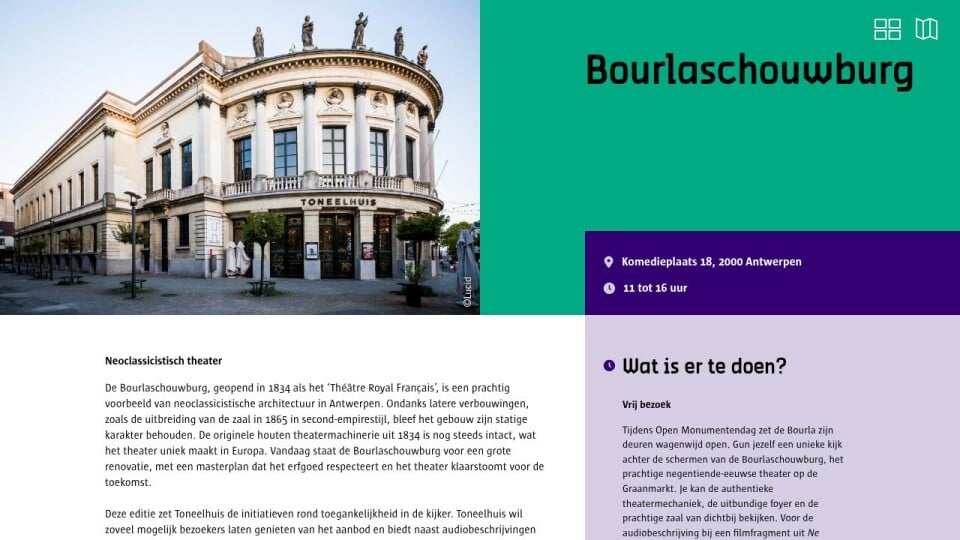 Tijdens Open Monumentendag zet de Bourla zijn deuren wagenwijd open. Gun jezelf een unieke kijk achter de schermen van de Bourlaschouwburg, het prachtige negentiende-eeuwse theater op de Graanmarkt. Je kan de authentieke theatermechaniek, de uitbundige foyer en de prachtige zaal van dichtbij bekijken. Voor de audiobeschrijving bij een filmfragment uit Ne Mobliez Mie (duur 5 minuten), haal je een hoofdtelefoon af aan een van de twee zijbalkons op de eerste verdieping van de Bourla.