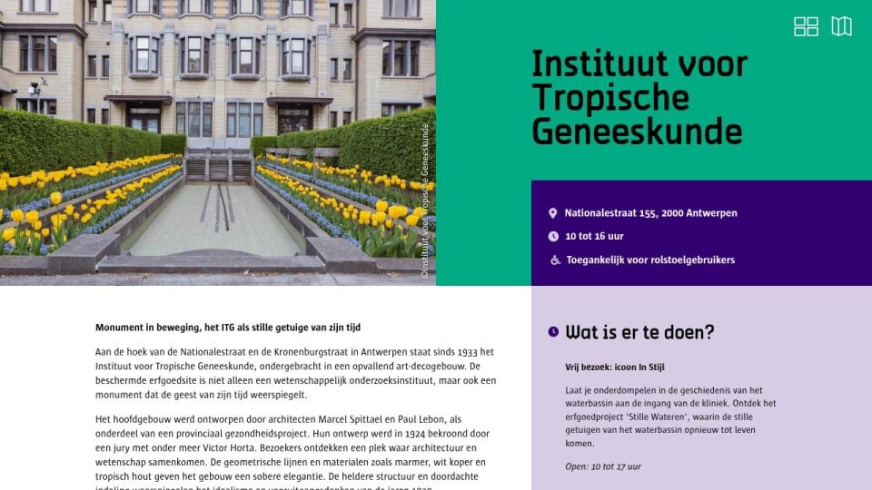 Aan de hoek van de Nationalestraat en de Kronenburgstraat in Antwerpen staat sinds 1933 het Instituut voor Tropische Geneeskunde, ondergebracht in een opvallend art-decogebouw. De beschermde erfgoedsite is niet alleen een wetenschappelijk onderzoeksinstituut, maar ook een monument dat de geest van zijn tijd weerspiegelt.