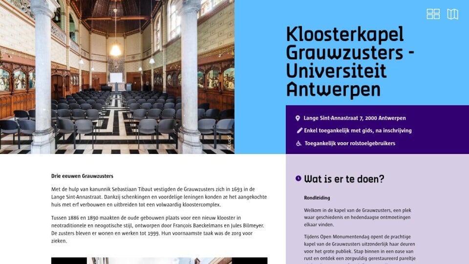 Tijdens Open Monumentendag opent de prachtige kapel van de Grauwzusters uitzonderlijk haar deuren voor het grote publiek. Stap binnen in een oase van rust en ontdek een zorgvuldig gerestaureerd pareltje uit het Antwerpse erfgoed. De voormalige kloosterkapel – ooit een plek van bezinning voor zusters die zich toelegden op ziekenzorg – ademt nog steeds de ingetogen sfeer van weleer.