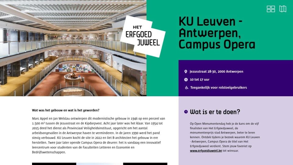 Op Open Monumentendag heb je de kans om de vijf finalisten van Het Erfgoedjuweel, de monumentenprijs stad Antwerpen, beter te leren kennen. Ontdek tijdens je bezoek waarom KU Leuven - Antwerpen, Campus Opera de titel van Het Erfgoedjuweel verdient. Stem jouw favoriet op www.erfgoedjuweel.be tot winnaar.