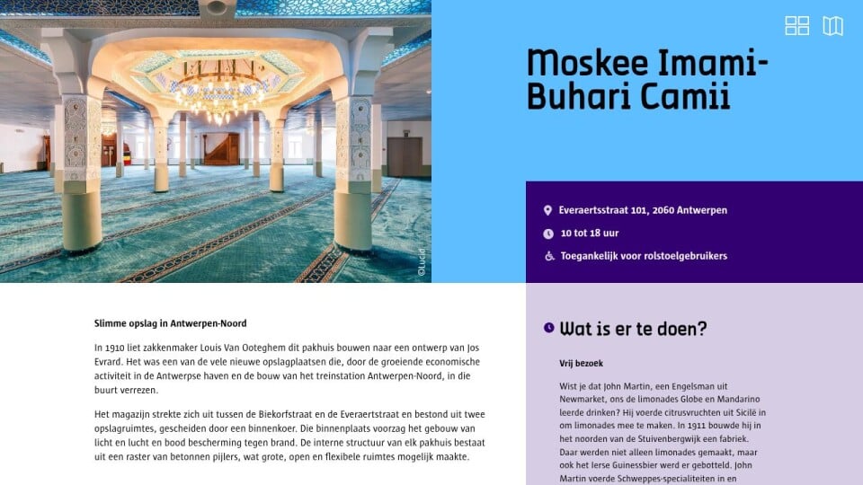 In 1993 kreeg het pand een nieuwe bestemming: het werd omgevormd tot de Turkse moskee Imami-Buhari Camii. Dankzij de flexibele magazijnstructuur kon het gebouw eenvoudig worden heringericht. Toch zijn de oorspronkelijke elementen nog herkenbaar. Op de inmiddels overdekte binnenplaats staat een grote kiosk die dienstdoet als wasruimte. Daar wassen moslims zich voor ze de gebedsruimte betreden. Op de eerste verdieping bevinden zich een kleine gebedsruimte, een gemeenschapsruimte met cafetaria en terras, een bibliotheek en klaslokalen. Op de tweede verdieping is er een grote gebedsruimte. De kolomstructuur van het vroegere magazijn is er duidelijk zichtbaar.