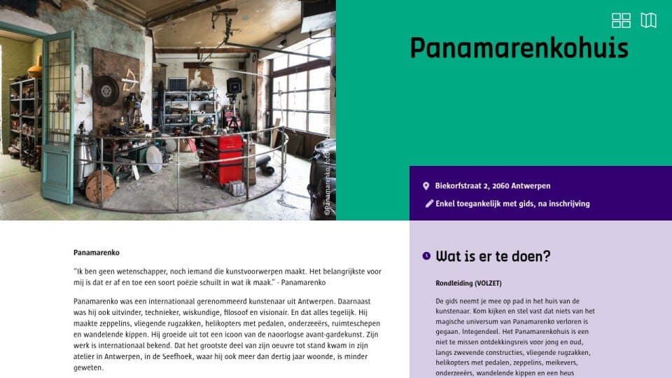 De gids neemt je mee op pad in het huis van de kunstenaar. Kom kijken en stel vast dat niets van het magische universum van Panamarenko verloren is gegaan. Integendeel. Het Panamarenkohuis is een niet te missen ontdekkingsreis voor jong en oud, langs zwevende constructies, vliegende rugzakken, helikopters met pedalen, zeppelins, meikevers, onderzeeërs, wandelende kippen en een heus helikopterplatform op het dak.