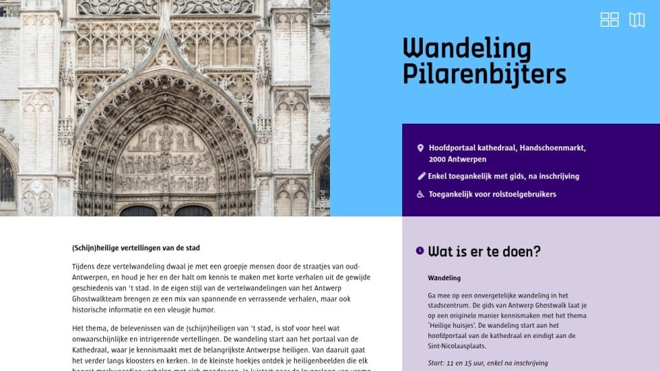 Het thema, de belevenissen van de (schijn)heiligen van 't stad, is stof voor heel wat onwaarschijnlijke en intrigerende vertellingen. De wandeling start aan het portaal van de Kathedraal, waar je kennismaakt met de belangrijkste Antwerpse heiligen. Van daaruit gaat het verder langs kloosters en kerken. In de kleinste hoekjes ontdek je heiligenbeelden die elk hoogst merkwaardige verhalen met zich meedragen. Je luistert naar de levensloop van vrome zielen die hun hemel probeerden te verdienen en door bovenmenselijke daden heilig werden. Over godsverering, en hoe die uit de hand liep. Over een wereld vol goed en kwaad, vol rituelen en bijgeloof, die het leven in de stad bepaalden. Over schijnheiligen, die liever kerkpilaren aanbidden dan goede gelovigen te zijn. Wat al die mensen bezielde, dat kom je te weten tijdens de vertelwandeling Pilarenbijters.